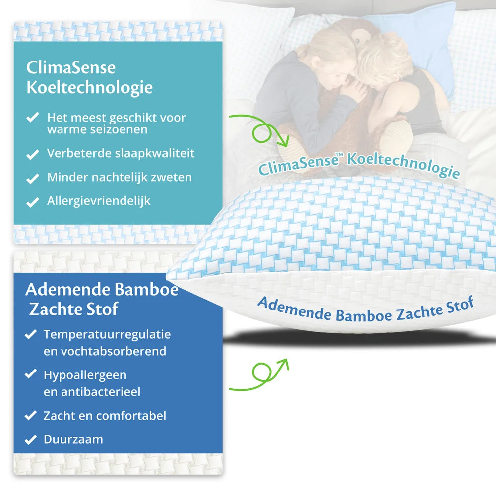 Met hoogwaardig memory foam en een dubbele hoes van ademend bamboe en ClimaSense koele stof, biedt dit kussen een perfecte balans tussen zachtheid en stevigheid.